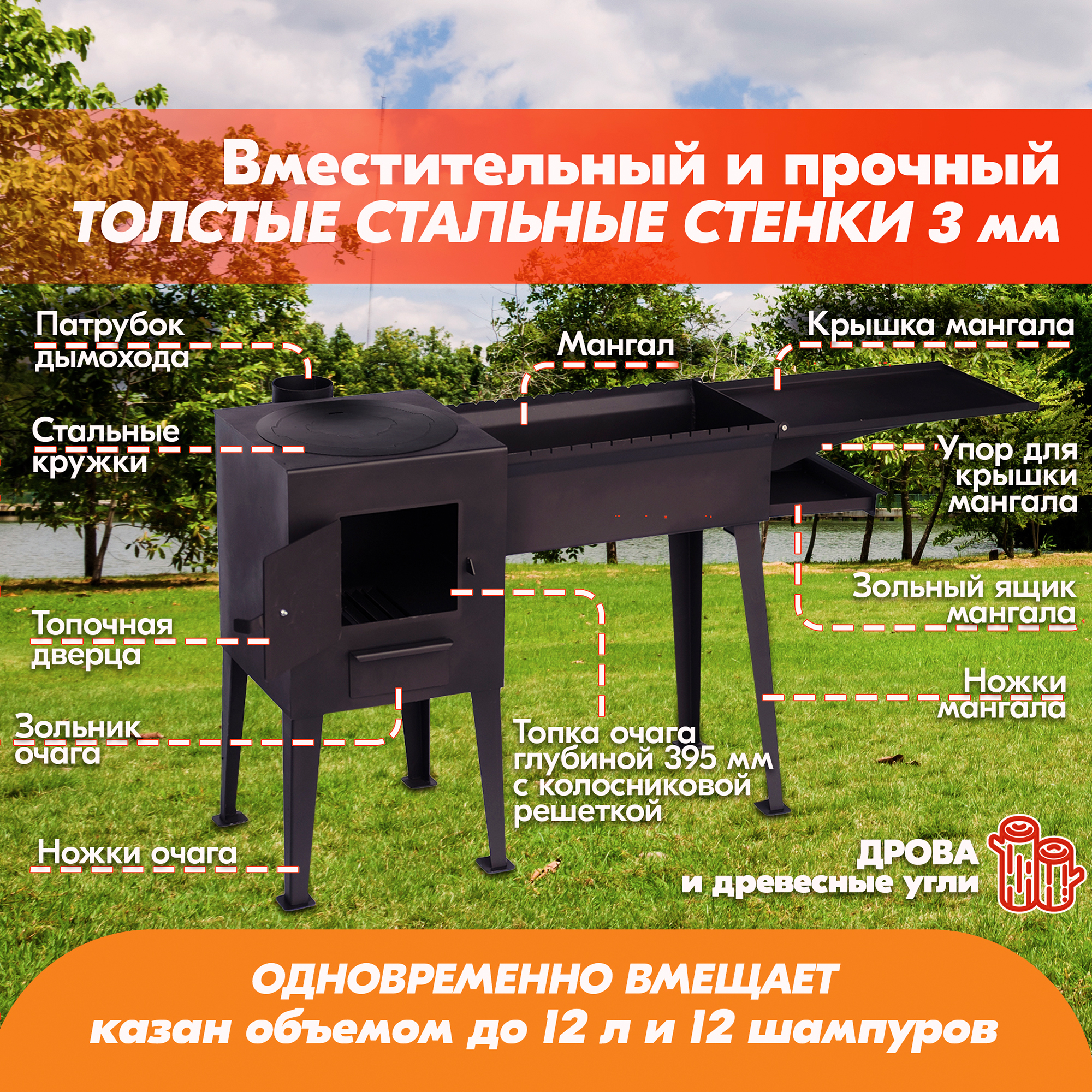 Стальной казан-мангал для дачи предназначен для приготовления пищи на живом огне, как на открытой площадке, так и в закрытом помещении (в этом случае обязательна установка системы дымохода).