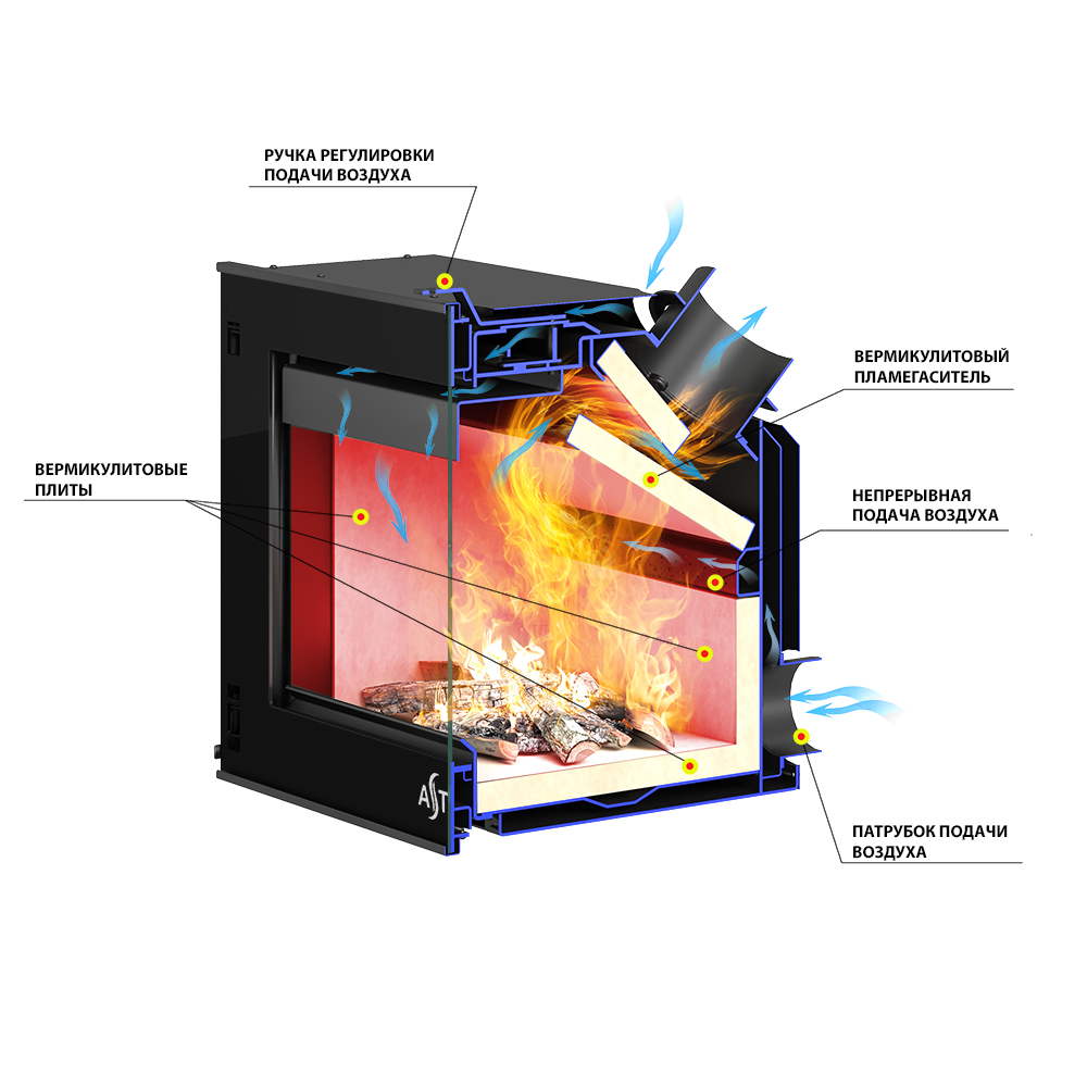Вермикулит – материал, способствующий сохранению геометрии топки, защищающий сталь от перегрева и хорошо сохраняющий тепло. Вермикулитовые стенки и дно топки запасают энергию во время горения дров или брикетов. По окончании горения внутренняя облицовка в течение 2-3 часов отдаёт накопленную энергию в пространство, поддерживая в помещении тепловой комфорт.