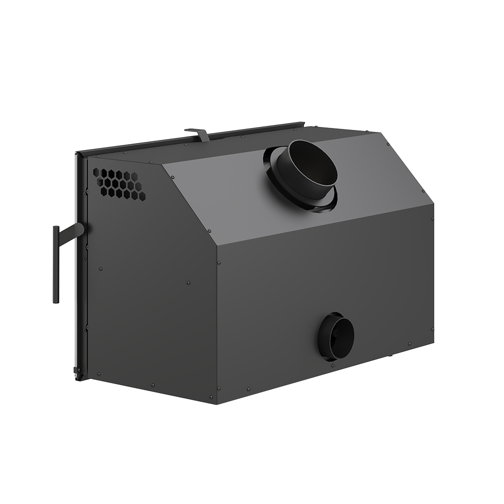 Стальной кожух каминной топки отстоит от корпуса на 3-4 сантиметра, что обеспечивает отличные конвекционные свойства теплового агрегата. Холодный воздух захватывается в щель снизу под дверью и, нагреваясь, выходит в верхней части боковых стенок кожуха. Таким образом обеспечивается быстрый прогрев помещения или объёма, расположенного под облицовкой камина.