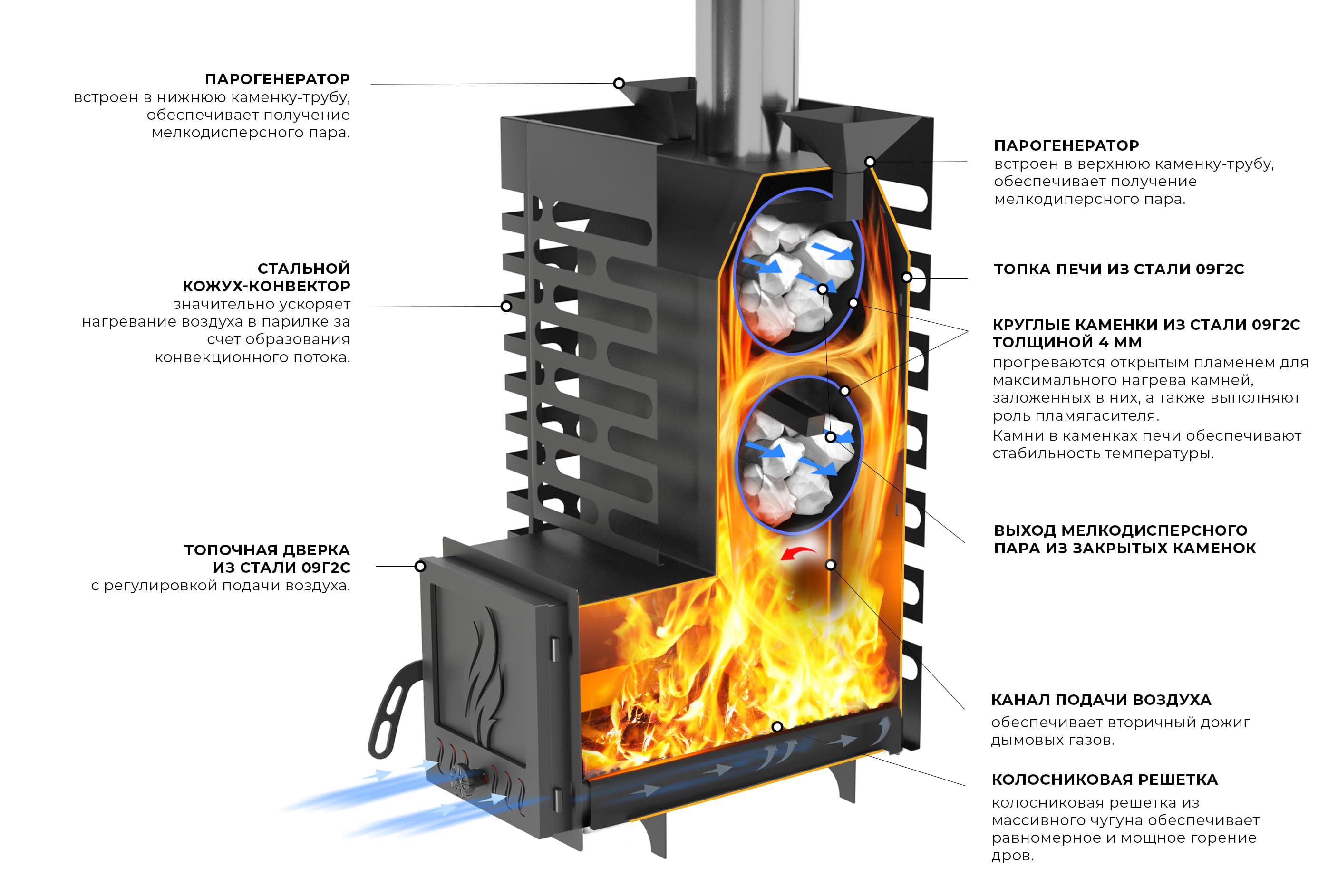 Стальной кожух-конвектор значительно ускоряет нагревание воздуха в парилке за счет образуемого им мощного воздушного потока.