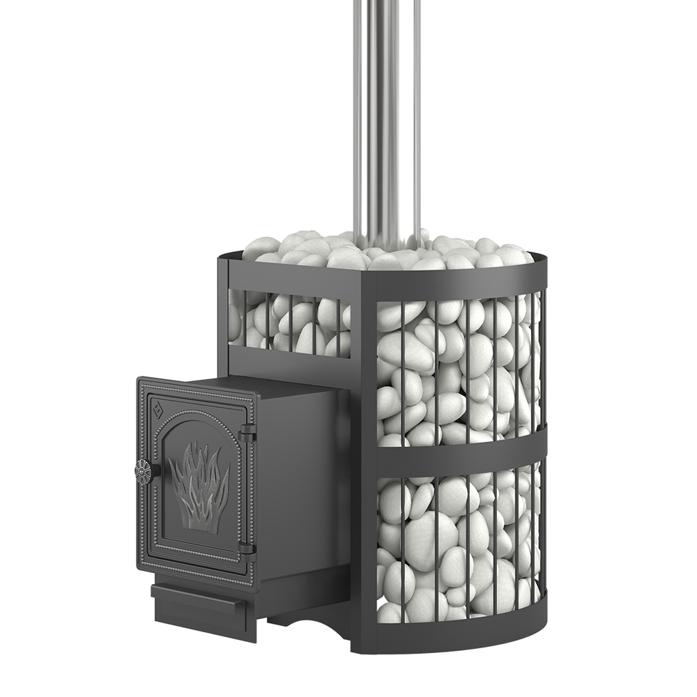 Для устройства наружной открытой каменки печь ЭТНА 18 оснащается металлическим кожухом с прорезным рисунком оригинального дизайна. Пространство между печью и кожухом из двухмиллиметровой стали заполняется камнями для бани, которые выполняют роль теплонакопителя, перераспределяют тепло от стенок топки и защищают парящихся от жёсткого инфракрасного излучения. Воду подают на нагретые камни, с которых полученный пар распространяется по всему объёму парной. Кожух диаметром 560 миллиметров вмещает в себя до 110 килограммов камней крупной и средней фракции.