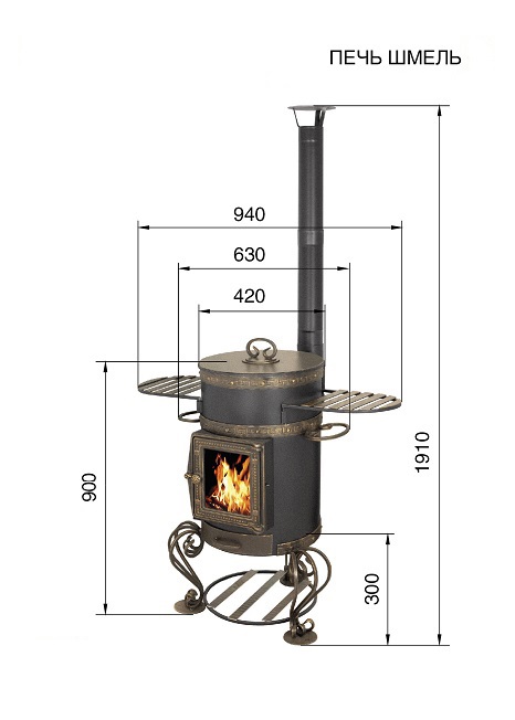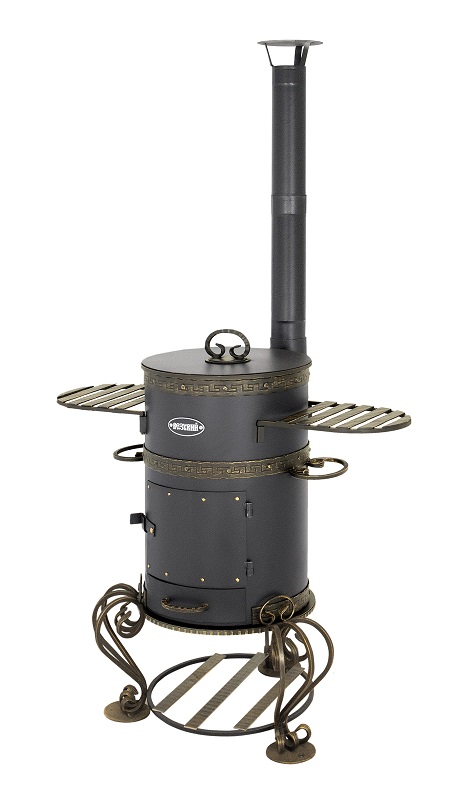 Печь под казан с трубой "Шмель " предназначена для приготовления пищи под открытым небом, благодаря тому, что печь под казан имеет высокую вытяжную трубу самоварного типа. Дым, выходящий из трубы, не мешает окружающим. Колосниковая решётка, выполненная из чугуна, выдвижным зольным ящиком позволяет удалить золу при работающей печи. Так же выдвижной зольный ящик дает возможность регулировать интенсивность горения дров в топке.