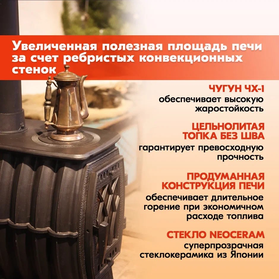 Литая из высокопрочного чугуна печь будет служить Вам неограниченно долго, при этом тепло в вашем доме не будет зависеть от перебоев электричества!