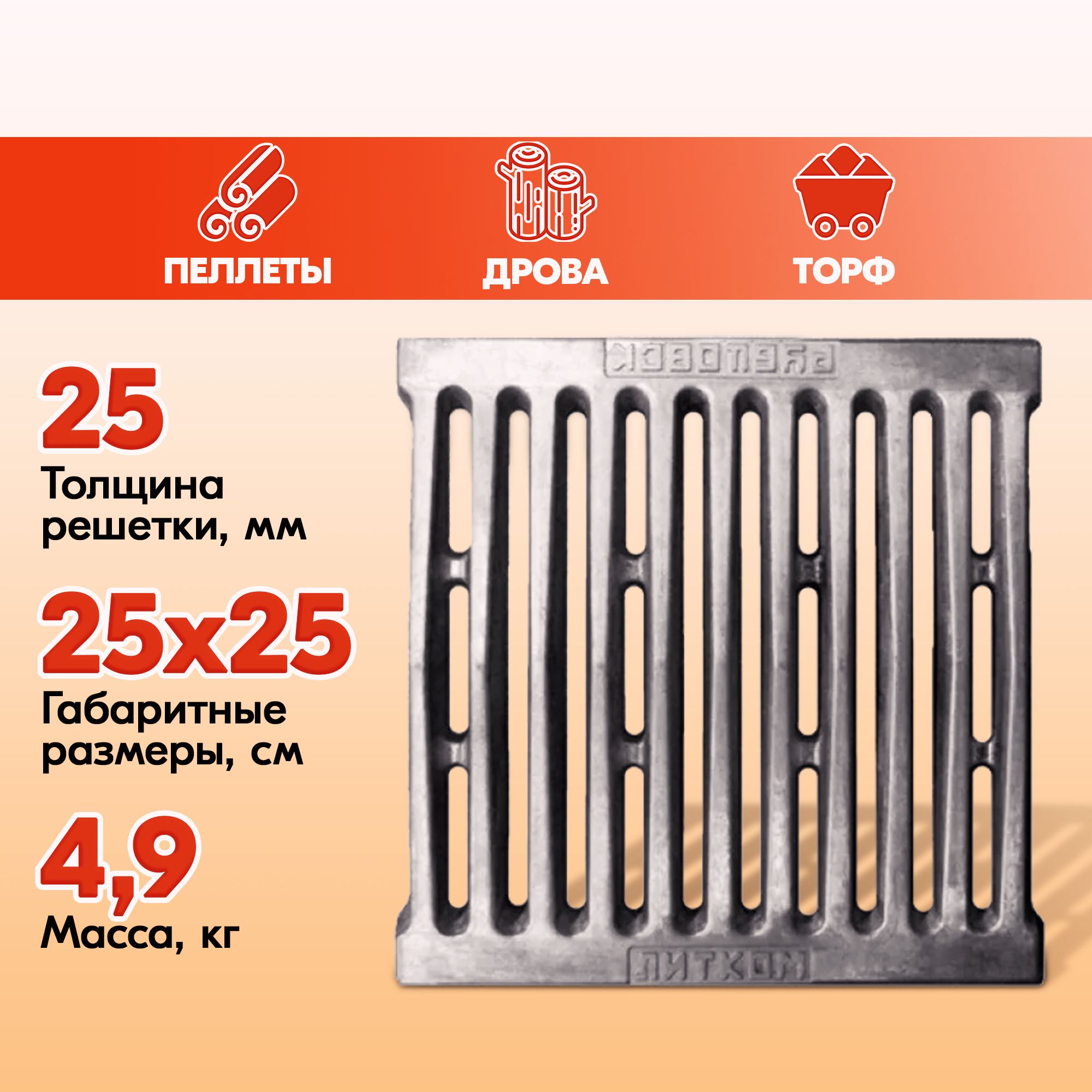 Модели колосниковых решеток для дров от Рубцовского завода ЛИТКОМ также пригодны к топке торфом или пеллетами.